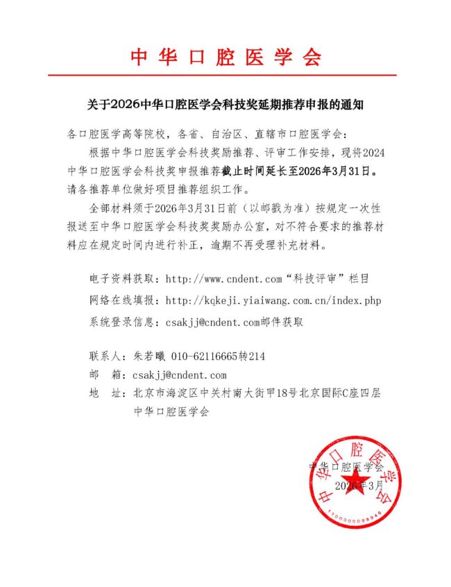 关于2024中华口腔医学会科技奖推荐工作及培训会的通知 中华口腔医学会科技奖cndent2023年11月27日中华口腔医学会科技奖是面向全国口腔医学领域设立的经常性科学技术奖,每两年评选一次,旨在奖励在口腔医学科学技术进步活动中做出突出贡献的单位和个人