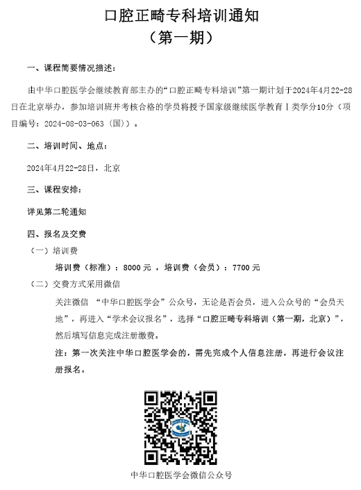 口腔正畸专科培训通知(第一期,北京)