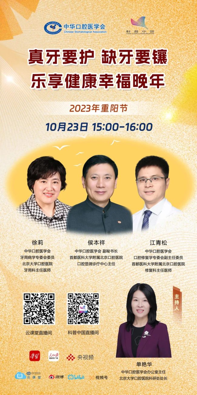 10月23日,中华口腔医学会将在重阳节期间推出“真牙要护 缺牙要镶 乐享健康幸福晚年”直播活动