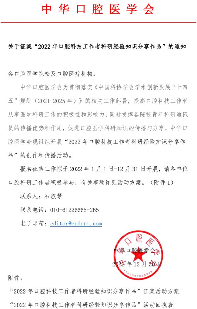 关于征集“2022 年口腔科技工作者科研经验知识分享作品”的通知