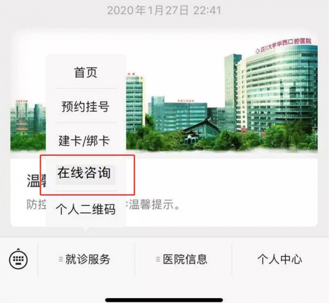 四川大学华西口腔医院开通免费在线咨询 医者风采cndent2020年2月7日为全力做好新型冠状病毒感染的肺炎疫情防控,解决非常时期患者不能及时就医问题,四川大学华西口腔医院近期开通了免费在线咨询服务,并推出口腔系列科普知识,服务人民群众口腔健康。