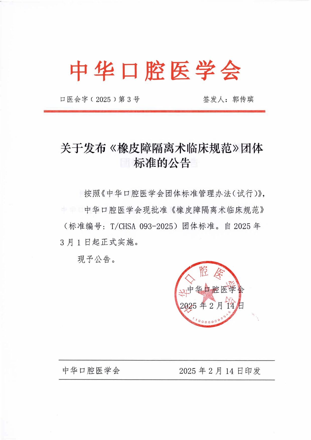 橡皮障隔离术临床规范 下载 关于发布《橡皮障隔离术临床规范》团体标准的公告 下载 文章导航历史的文章历史的文章:身处西部的价值感和幸福感未来的文章未来的文章:中华口腔医学会“西部行”公益活动志愿者体会Related Posts关于开展2026年“世界口腔健康日”活动的倡议通知2026年2月27日中华口腔医学会民营口腔医疗分会第18次民营口腔年会会议服务项目公开招标公告2026年2月6日牙体牙髓病学临床技术规范化操作培训班2025汕尾站举办2025年12月22日正畸临床指南及规范化新技术研讨班(上海站)一轮通知2025年12月12日中华口腔医学会2026年继续教育部招聘信息2025年12月9日2026中华口腔医学会科技奖推荐工作通知2025年12月1日