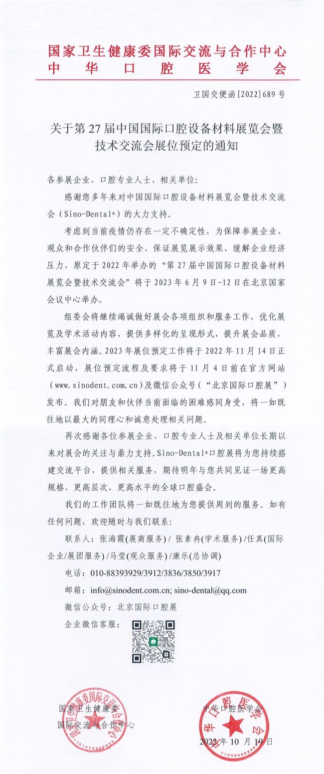 关于第27届中国国际口腔设备材料展览会暨技术交流会展位预定的通知 通知公告cndent2022年10月26日各参展企业、口腔专业人士、相关单位:感谢您多年来对中国国际口腔设备材料展览会暨技术交流会的大力支持。